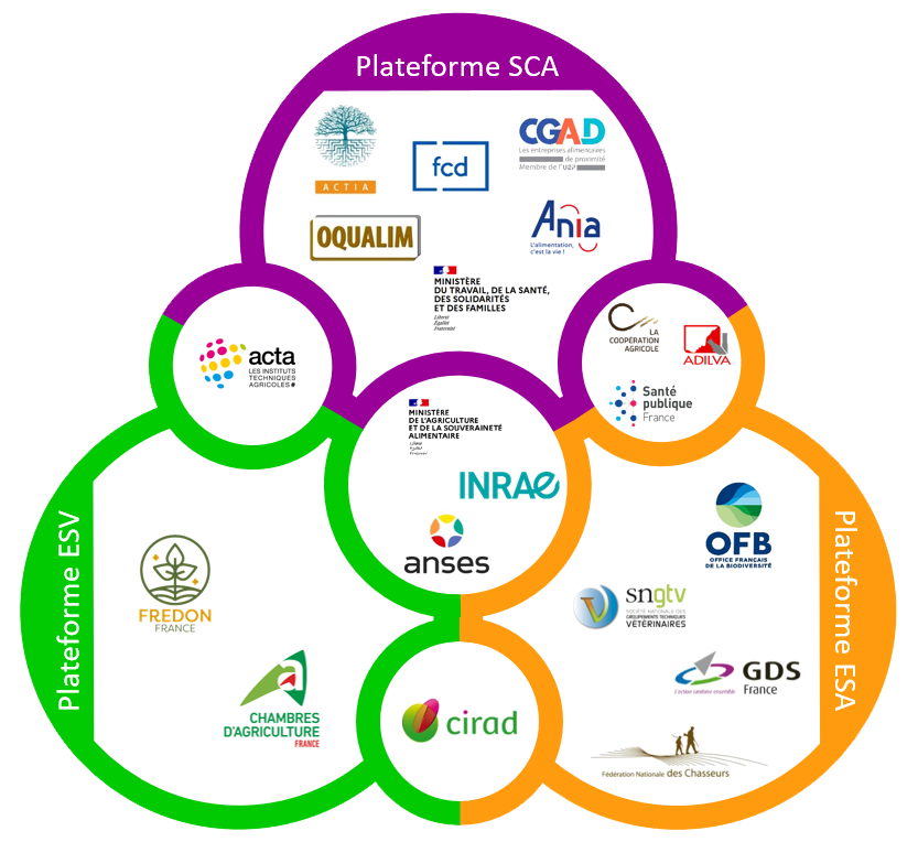 Après sept premières années démontrant l’intérêt de la Plateforme ESA, le ministère en charge de l’agriculture, a décidé en 2017 d’étendre ce concept aux domaines de la santé végétale et de sécurité de la chaîne alimentaire (Figure 2), répondant ainsi aux recommandations des États généraux de l’Alimentation qui s’étaient tenus la même année, l’atelier n°8 de ces États ayant conclu à la nécessité de mettre en œuvre une surveillance efficace pour prévenir les crises en s’appuyant sur les plateformes d’épidémiosurveillance.