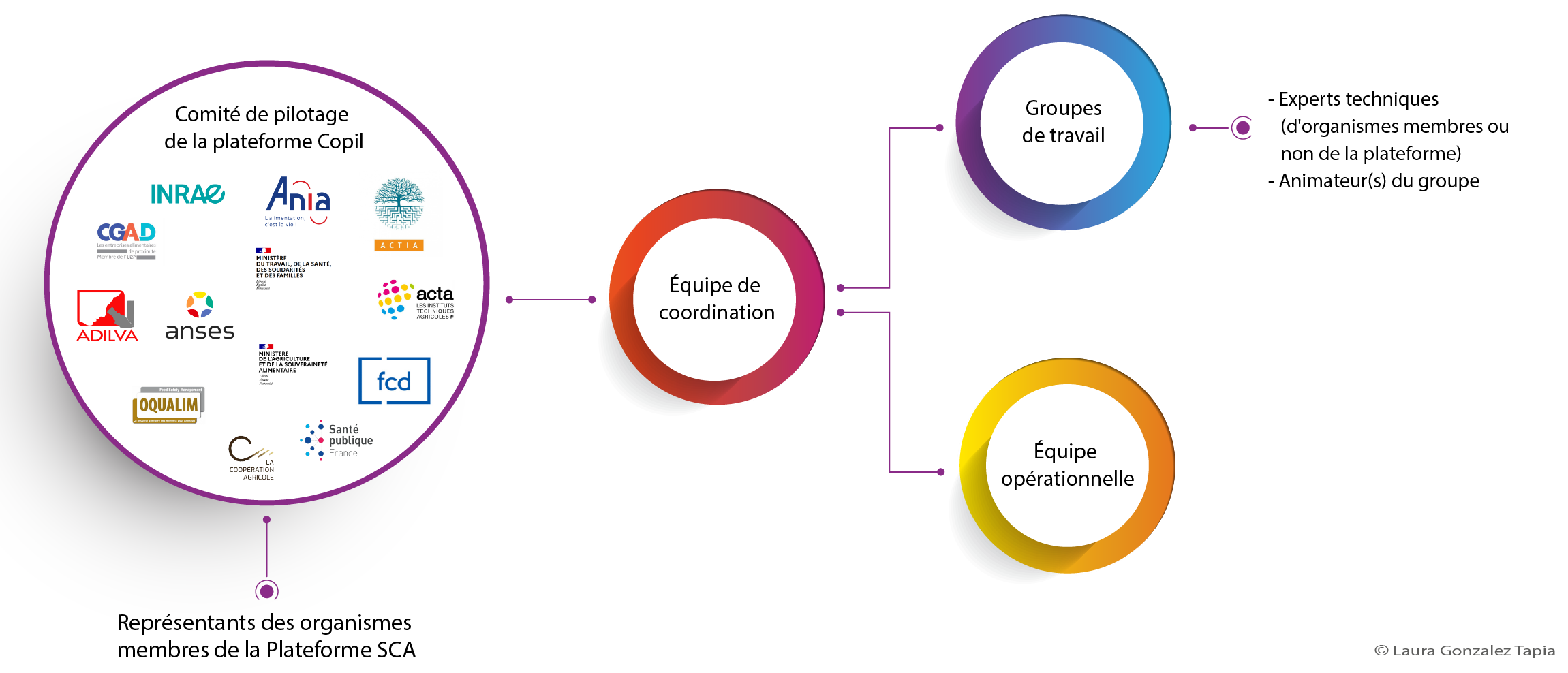 Comme les deux autres Plateformes d’épidémiosurveillance en santé animale et en santé végétale, la Plateforme SCA s’appuie sur une structure de gouvernance dénommée comité de pilotage, une équipe de coordination et une équipe opérationnelle.