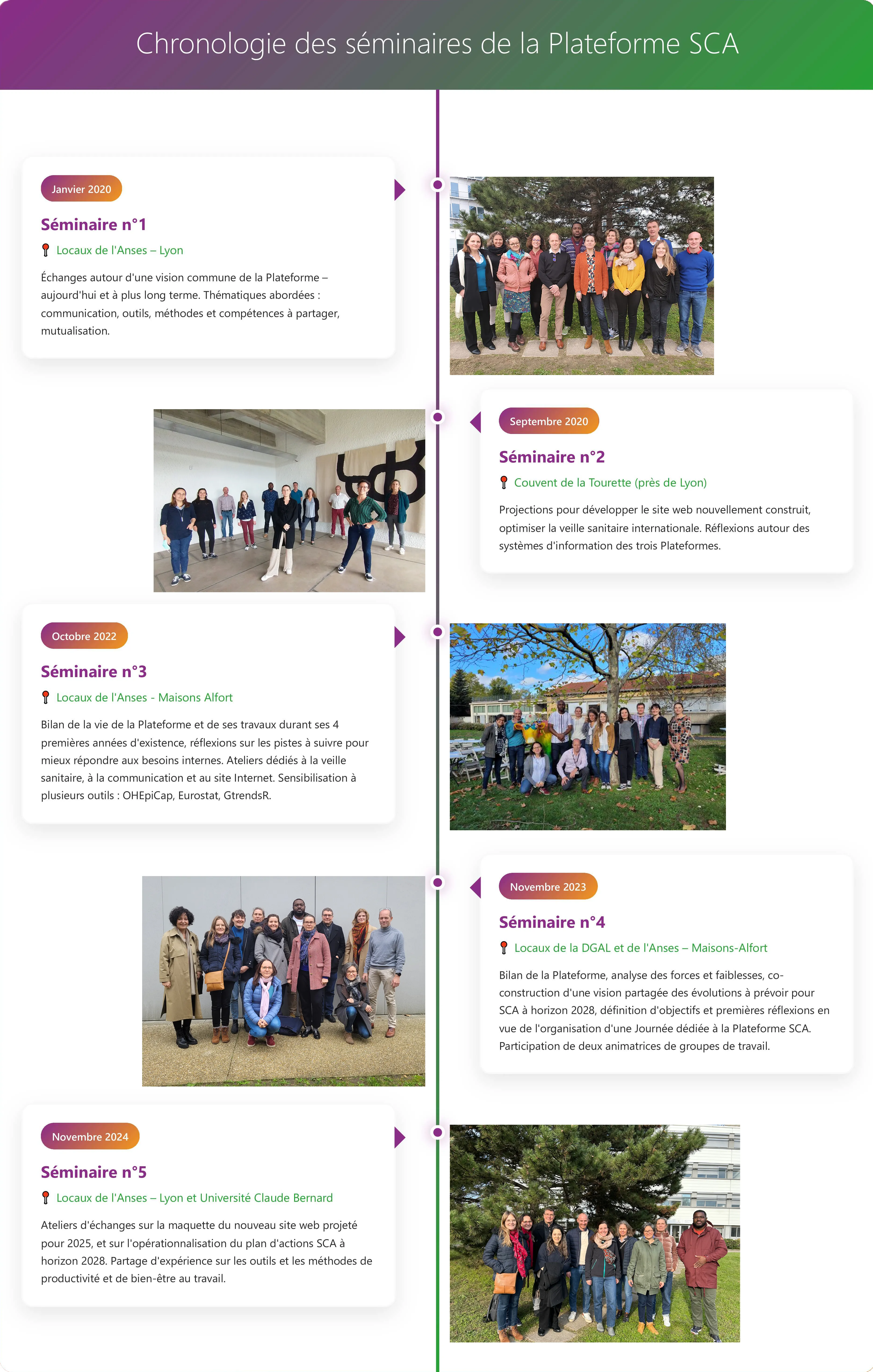 Les membres de l’équipe de la Plateforme – réunissant la coordination et l’équipe opérationnelle - sont basés à Paris, Lyon et Nantes. Des séminaires de deux jours sont donc organisés presque chaque année pour échanger sur des thématiques structurantes pour la Plateforme SCA, telles que la définition d’objectifs, l’opérationnalisation des actions à mener, la construction du site internet, le développement de la veille sanitaire, le partage d’outils etc. Ces séminaires sont aussi l’occasion de partager des moments de convivialité, de bonne humeur et d’émulation !